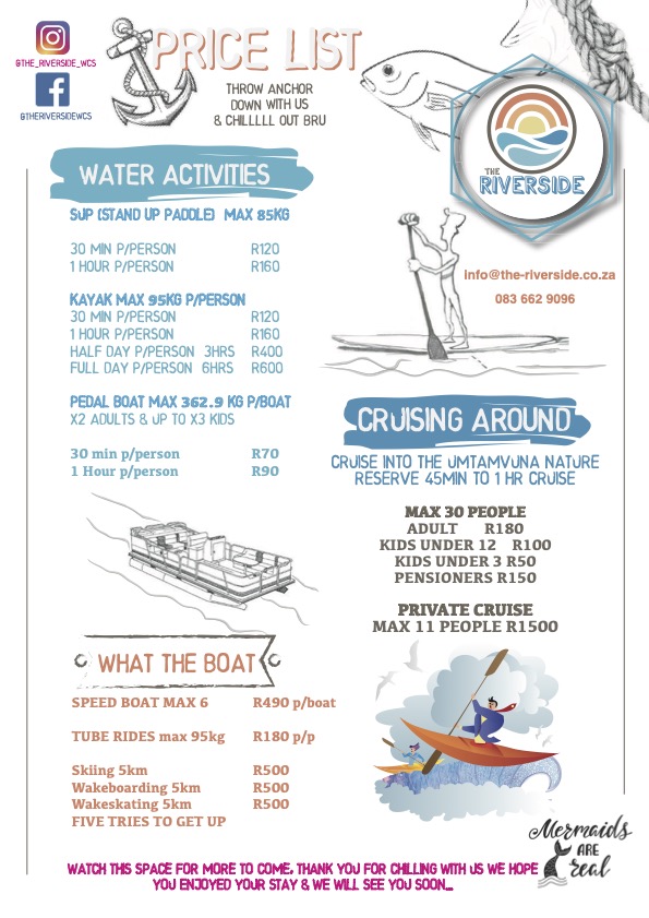 Very few bars in Port Edward combine adventure and relaxation in one location. To complement the extensive variety of outdoor activities on offer at the Wild Coast Sun, The Riverside Aqua Sports and Beach Bar offers a fantastic selection of water sports and river activities which include kayaking, speed boats, paddle boats, tube rides, water skiing and a lazy boat cruise.